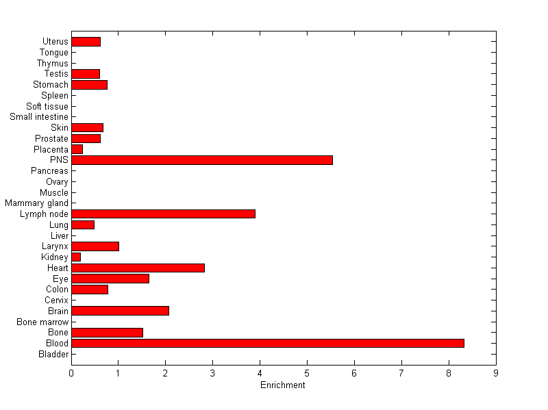 The expression level is normalized with tissue-library size. Each value for a gene in a tissue is a ratio of observed ESTs to the expected one in this tissue. The expected number of ESTs is the product of total ESTs of the gene and the fraction of total ESTs in the tissue among all ESTs in 30 tissues.