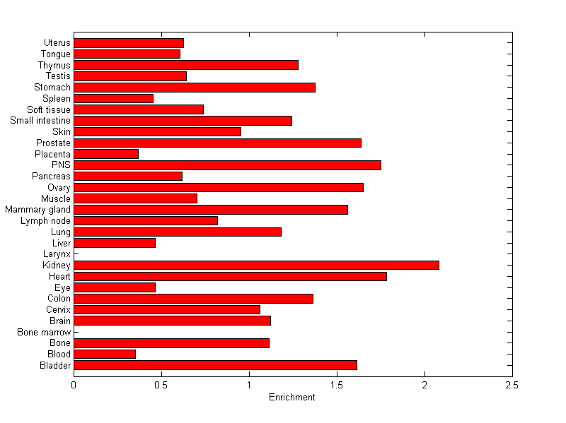 The expression level is normalized with tissue-library size. Each value for a gene in a tissue is a ratio of observed ESTs to the expected one in this tissue. The expected number of ESTs is the product of total ESTs of the gene and the fraction of total ESTs in the tissue among all ESTs in 30 tissues.