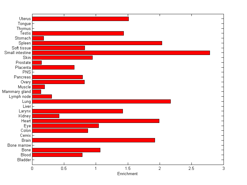 The expression level is normalized with tissue-library size. Each value for a gene in a tissue is a ratio of observed ESTs to the expected one in this tissue. The expected number of ESTs is the product of total ESTs of the gene and the fraction of total ESTs in the tissue among all ESTs in 30 tissues.