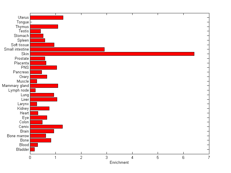 The expression level is normalized with tissue-library size. Each value for a gene in a tissue is a ratio of observed ESTs to the expected one in this tissue. The expected number of ESTs is the product of total ESTs of the gene and the fraction of total ESTs in the tissue among all ESTs in 30 tissues.