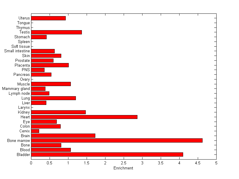 The expression level is normalized with tissue-library size. Each value for a gene in a tissue is a ratio of observed ESTs to the expected one in this tissue. The expected number of ESTs is the product of total ESTs of the gene and the fraction of total ESTs in the tissue among all ESTs in 30 tissues.