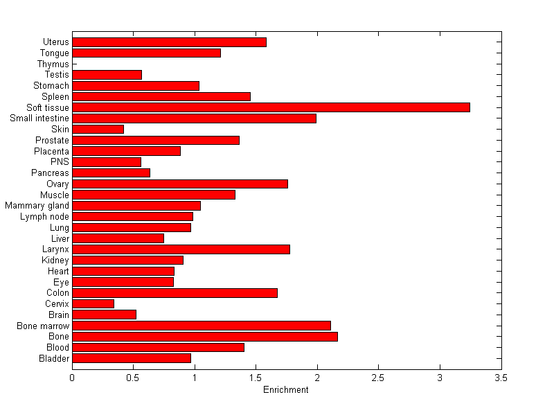 The expression level is normalized with tissue-library size. Each value for a gene in a tissue is a ratio of observed ESTs to the expected one in this tissue. The expected number of ESTs is the product of total ESTs of the gene and the fraction of total ESTs in the tissue among all ESTs in 30 tissues.