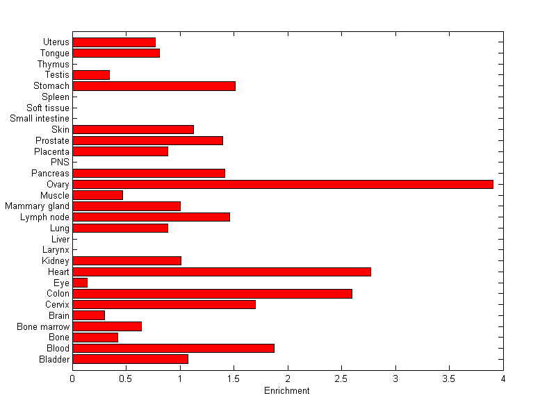The expression level is normalized with tissue-library size. Each value for a gene in a tissue is a ratio of observed ESTs to the expected one in this tissue. The expected number of ESTs is the product of total ESTs of the gene and the fraction of total ESTs in the tissue among all ESTs in 30 tissues.