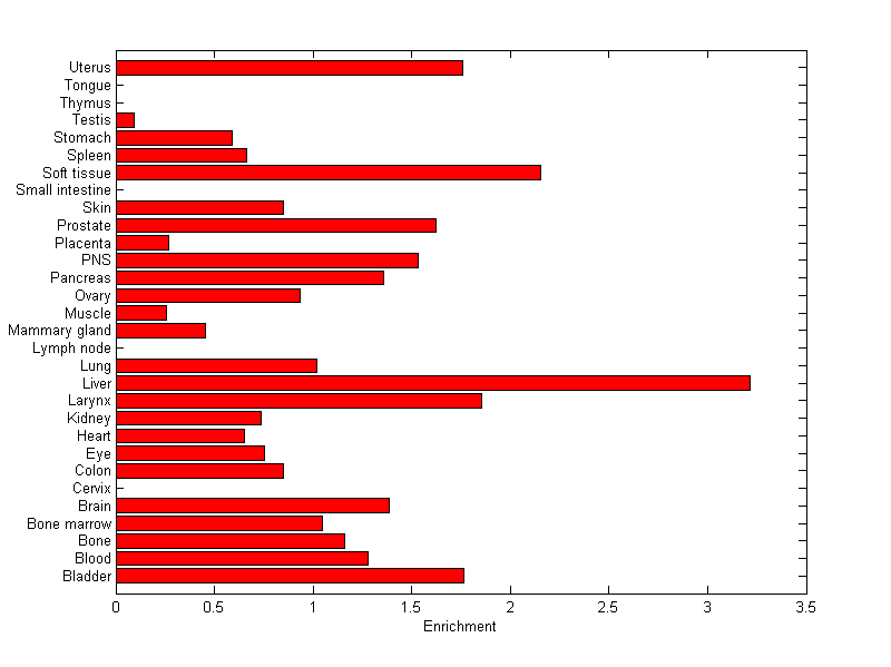 The expression level is normalized with tissue-library size. Each value for a gene in a tissue is a ratio of observed ESTs to the expected one in this tissue. The expected number of ESTs is the product of total ESTs of the gene and the fraction of total ESTs in the tissue among all ESTs in 30 tissues.