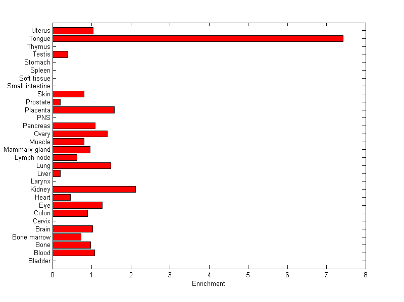 The expression level is normalized with tissue-library size. Each value for a gene in a tissue is a ratio of observed ESTs to the expected one in this tissue. The expected number of ESTs is the product of total ESTs of the gene and the fraction of total ESTs in the tissue among all ESTs in 30 tissues.
