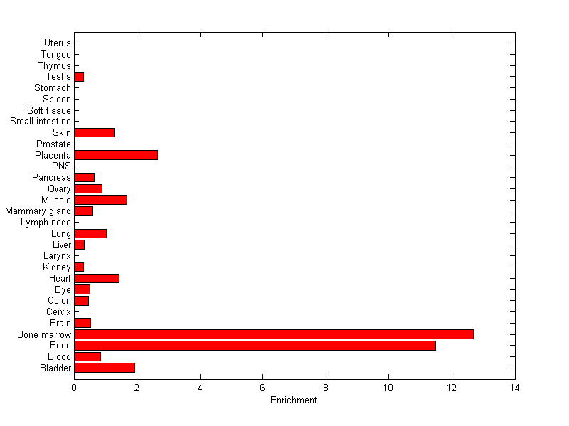 About the profile: The expression level is normalized with tissue-library size. Each value for a gene in a tissue is a ratio of observed ESTs to the expected one in this tissue. The expected number of ESTs is the product of total ESTs of the gene and the fraction of total ESTs in the tissue among all ESTs in 30 tissues. Summary: This gene is preferentially expressed in [bone, bone_marrow] Download: |