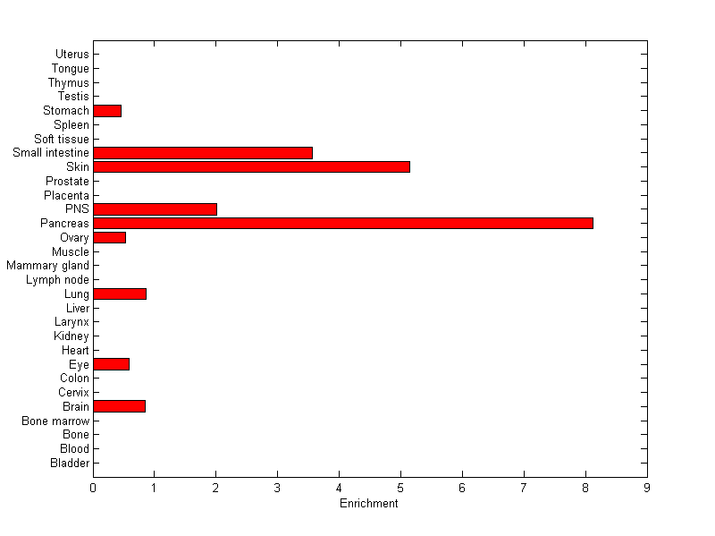 About the profile: The expression level is normalized with tissue-library size. Each value for a gene in a tissue is a ratio of observed ESTs to the expected one in this tissue. The expected number of ESTs is the product of total ESTs of the gene and the fraction of total ESTs in the tissue among all ESTs in 30 tissues. Summary: This gene is preferentially expressed in [pancreas, skin] Download: |