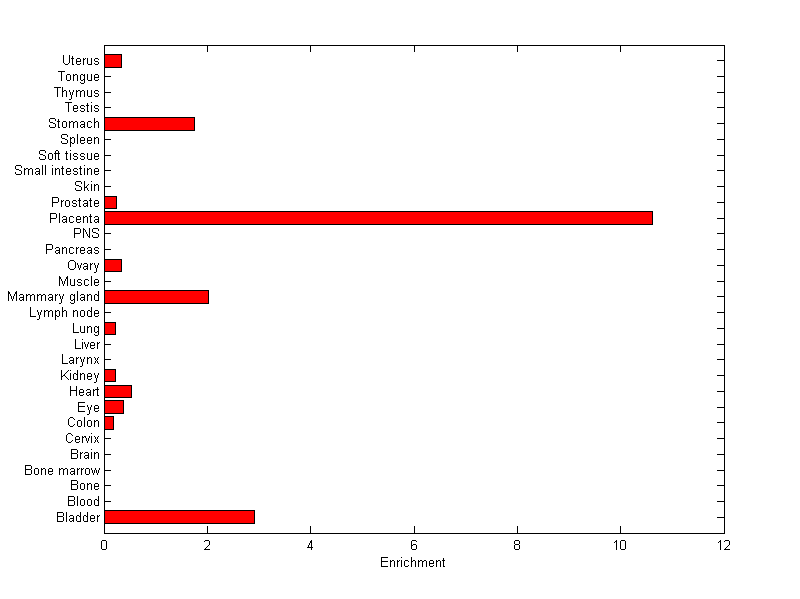 The expression level is normalized with tissue-library size. Each value for a gene in a tissue is a ratio of observed ESTs to the expected one in this tissue. The expected number of ESTs is the product of total ESTs of the gene and the fraction of total ESTs in the tissue among all ESTs in 30 tissues.