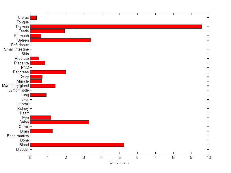 The expression level is normalized with tissue-library size. Each value for a gene in a tissue is a ratio of observed ESTs to the expected one in this tissue. The expected number of ESTs is the product of total ESTs of the gene and the fraction of total ESTs in the tissue among all ESTs in 30 tissues.