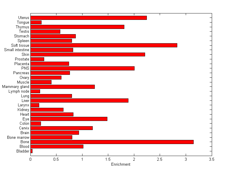 The expression level is normalized with tissue-library size. Each value for a gene in a tissue is a ratio of observed ESTs to the expected one in this tissue. The expected number of ESTs is the product of total ESTs of the gene and the fraction of total ESTs in the tissue among all ESTs in 30 tissues.