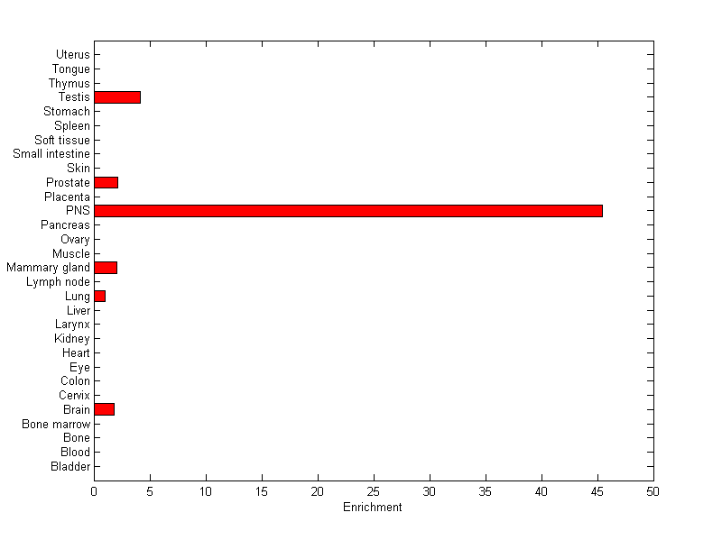 The expression level is normalized with tissue-library size. Each value for a gene in a tissue is a ratio of observed ESTs to the expected one in this tissue. The expected number of ESTs is the product of total ESTs of the gene and the fraction of total ESTs in the tissue among all ESTs in 30 tissues.