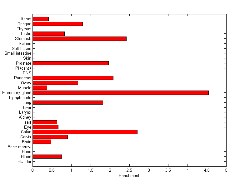 The expression level is normalized with tissue-library size. Each value for a gene in a tissue is a ratio of observed ESTs to the expected one in this tissue. The expected number of ESTs is the product of total ESTs of the gene and the fraction of total ESTs in the tissue among all ESTs in 30 tissues.