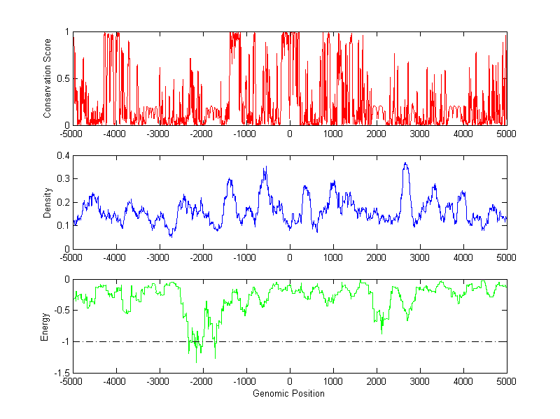 About the profiles: The conservation profile (red curve) is about conservation scores of the promoter sequences. Conservation was determined from an eight-way alignment of human, chimpanzee, dog, mouse, rat, chicken, zebrafish and fugu sequences. The conservation was quantified by a conservation score between 0 and 1, with 1 as highest conservation. The conservation score was obtained from UCSC genome databases. The density profile (blue curve) is about density of all TF binding sites. The energy profile (green curve) is about energy for module detection based on TF interaction. The positions with energy less than -1 indicate the existence of CRMs. Download: Conservation profileDensity profile Energy profile CRM summary |