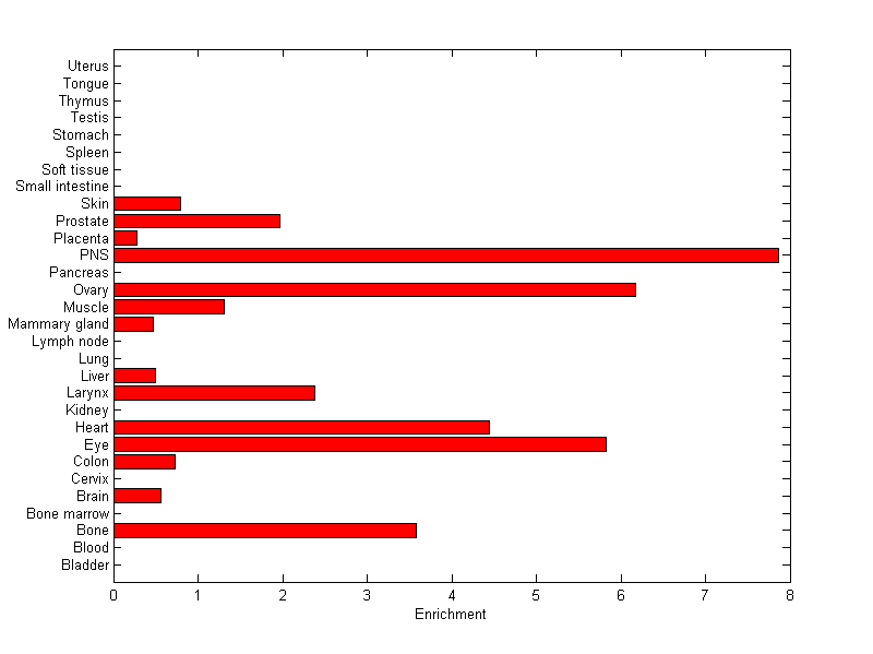 About the profile: The expression level is normalized with tissue-library size. Each value for a gene in a tissue is a ratio of observed ESTs to the expected one in this tissue. The expected number of ESTs is the product of total ESTs of the gene and the fraction of total ESTs in the tissue among all ESTs in 30 tissues. Summary: This gene is preferentially expressed in [eye, ovary] Download: |