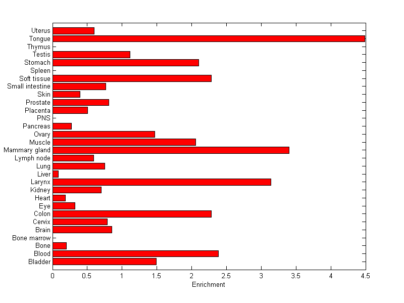 The expression level is normalized with tissue-library size. Each value for a gene in a tissue is a ratio of observed ESTs to the expected one in this tissue. The expected number of ESTs is the product of total ESTs of the gene and the fraction of total ESTs in the tissue among all ESTs in 30 tissues.
