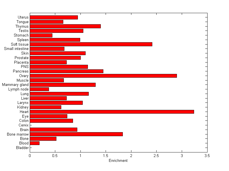 The expression level is normalized with tissue-library size. Each value for a gene in a tissue is a ratio of observed ESTs to the expected one in this tissue. The expected number of ESTs is the product of total ESTs of the gene and the fraction of total ESTs in the tissue among all ESTs in 30 tissues.