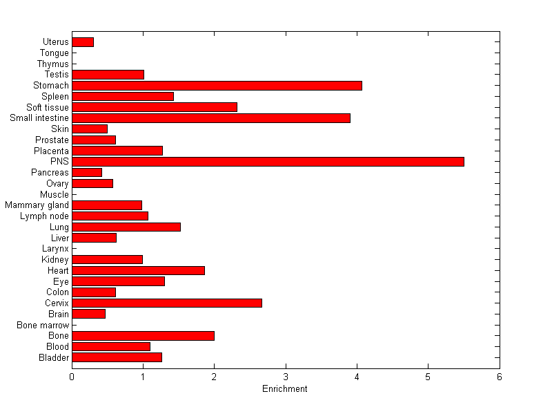 The expression level is normalized with tissue-library size. Each value for a gene in a tissue is a ratio of observed ESTs to the expected one in this tissue. The expected number of ESTs is the product of total ESTs of the gene and the fraction of total ESTs in the tissue among all ESTs in 30 tissues.