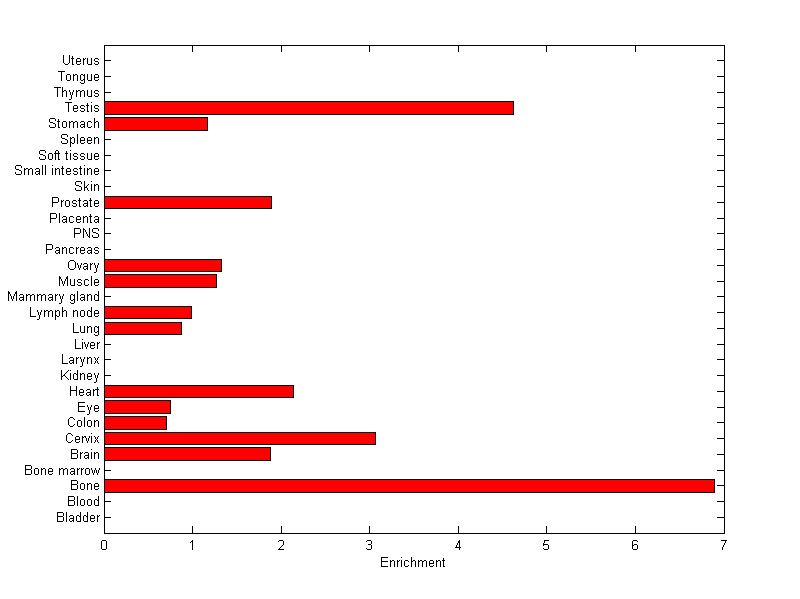 The expression level is normalized with tissue-library size. Each value for a gene in a tissue is a ratio of observed ESTs to the expected one in this tissue. The expected number of ESTs is the product of total ESTs of the gene and the fraction of total ESTs in the tissue among all ESTs in 30 tissues.