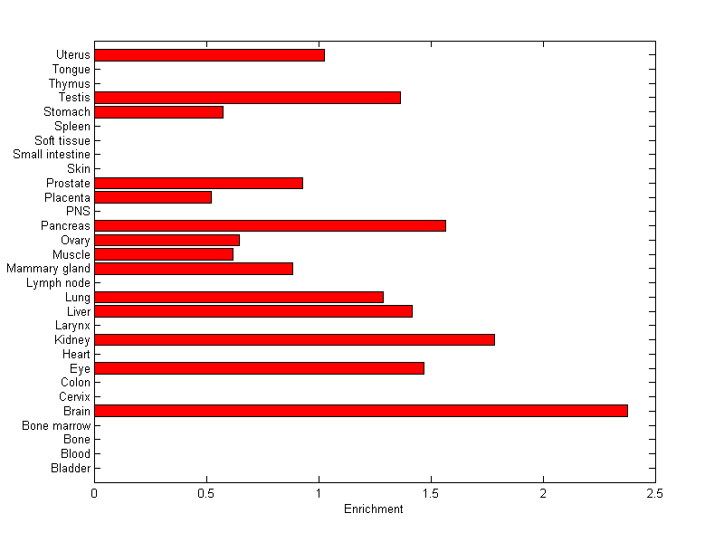 The expression level is normalized with tissue-library size. Each value for a gene in a tissue is a ratio of observed ESTs to the expected one in this tissue. The expected number of ESTs is the product of total ESTs of the gene and the fraction of total ESTs in the tissue among all ESTs in 30 tissues.
