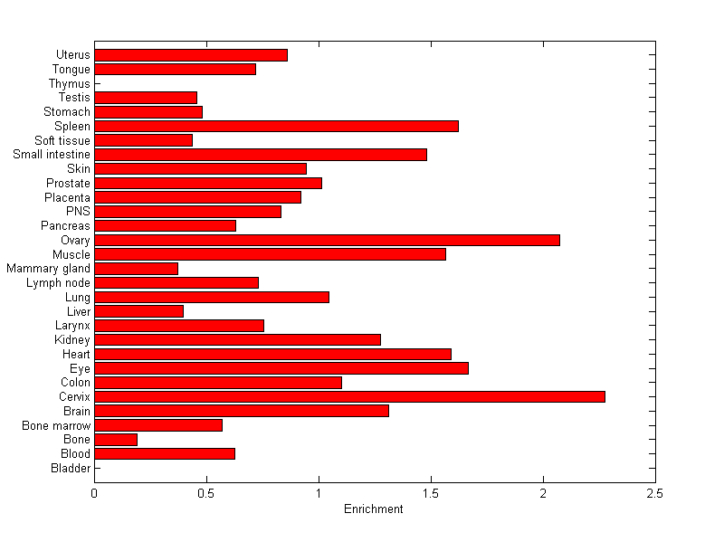 The expression level is normalized with tissue-library size. Each value for a gene in a tissue is a ratio of observed ESTs to the expected one in this tissue. The expected number of ESTs is the product of total ESTs of the gene and the fraction of total ESTs in the tissue among all ESTs in 30 tissues.