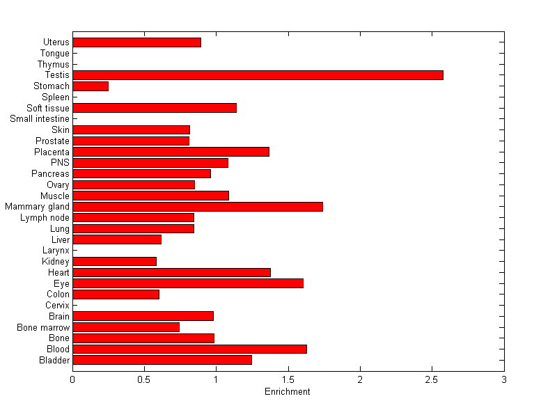 The expression level is normalized with tissue-library size. Each value for a gene in a tissue is a ratio of observed ESTs to the expected one in this tissue. The expected number of ESTs is the product of total ESTs of the gene and the fraction of total ESTs in the tissue among all ESTs in 30 tissues.