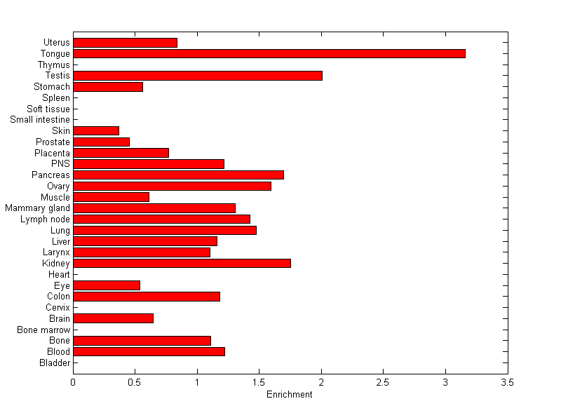 The expression level is normalized with tissue-library size. Each value for a gene in a tissue is a ratio of observed ESTs to the expected one in this tissue. The expected number of ESTs is the product of total ESTs of the gene and the fraction of total ESTs in the tissue among all ESTs in 30 tissues.