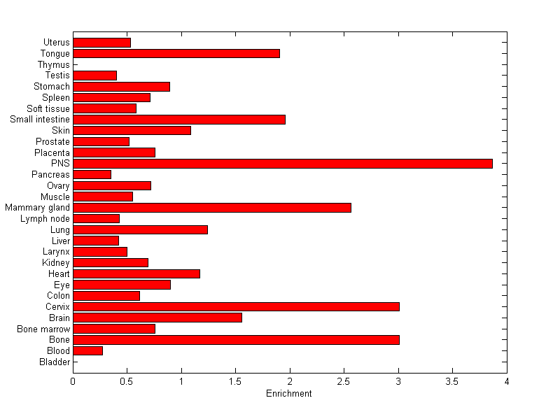 The expression level is normalized with tissue-library size. Each value for a gene in a tissue is a ratio of observed ESTs to the expected one in this tissue. The expected number of ESTs is the product of total ESTs of the gene and the fraction of total ESTs in the tissue among all ESTs in 30 tissues.