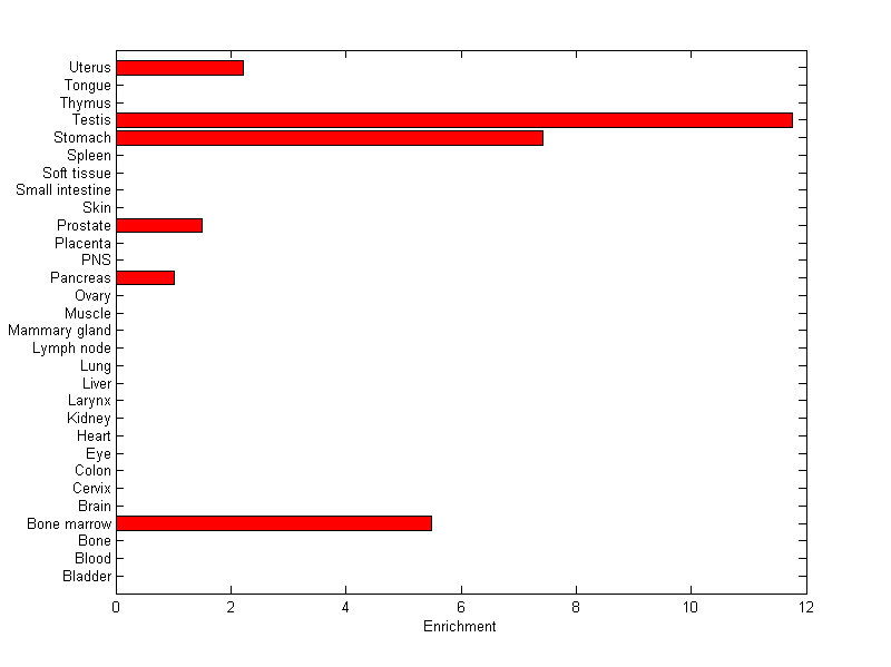 The expression level is normalized with tissue-library size. Each value for a gene in a tissue is a ratio of observed ESTs to the expected one in this tissue. The expected number of ESTs is the product of total ESTs of the gene and the fraction of total ESTs in the tissue among all ESTs in 30 tissues.