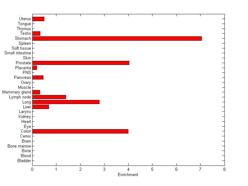 The expression level is normalized with tissue-library size. Each value for a gene in a tissue is a ratio of observed ESTs to the expected one in this tissue. The expected number of ESTs is the product of total ESTs of the gene and the fraction of total ESTs in the tissue among all ESTs in 30 tissues.