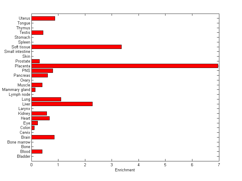 The expression level is normalized with tissue-library size. Each value for a gene in a tissue is a ratio of observed ESTs to the expected one in this tissue. The expected number of ESTs is the product of total ESTs of the gene and the fraction of total ESTs in the tissue among all ESTs in 30 tissues.