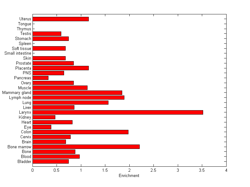 The expression level is normalized with tissue-library size. Each value for a gene in a tissue is a ratio of observed ESTs to the expected one in this tissue. The expected number of ESTs is the product of total ESTs of the gene and the fraction of total ESTs in the tissue among all ESTs in 30 tissues.
