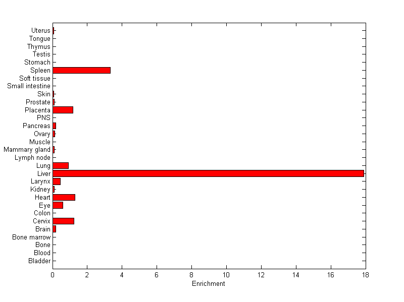 The expression level is normalized with tissue-library size. Each value for a gene in a tissue is a ratio of observed ESTs to the expected one in this tissue. The expected number of ESTs is the product of total ESTs of the gene and the fraction of total ESTs in the tissue among all ESTs in 30 tissues.