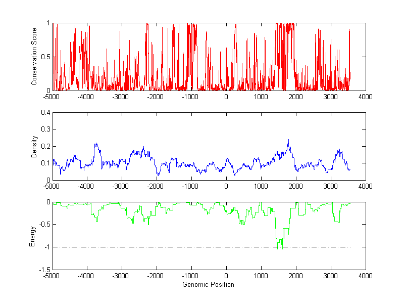 The energy profile (green curve) is about energy for module detection based on TF interaction. The positions with energy less than -1 indicate the existence of CRMs.