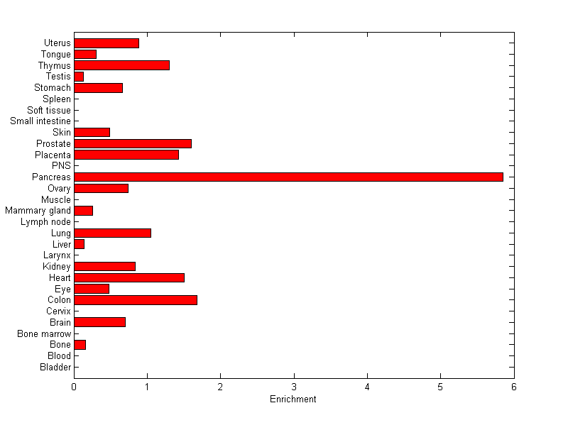 The expression level is normalized with tissue-library size. Each value for a gene in a tissue is a ratio of observed ESTs to the expected one in this tissue. The expected number of ESTs is the product of total ESTs of the gene and the fraction of total ESTs in the tissue among all ESTs in 30 tissues.