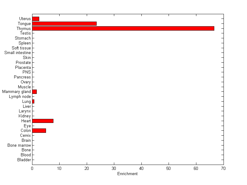 The expression level is normalized with tissue-library size. Each value for a gene in a tissue is a ratio of observed ESTs to the expected one in this tissue. The expected number of ESTs is the product of total ESTs of the gene and the fraction of total ESTs in the tissue among all ESTs in 30 tissues.