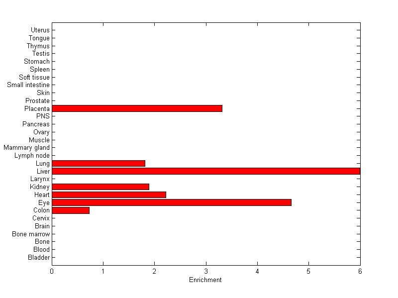 The expression level is normalized with tissue-library size. Each value for a gene in a tissue is a ratio of observed ESTs to the expected one in this tissue. The expected number of ESTs is the product of total ESTs of the gene and the fraction of total ESTs in the tissue among all ESTs in 30 tissues.