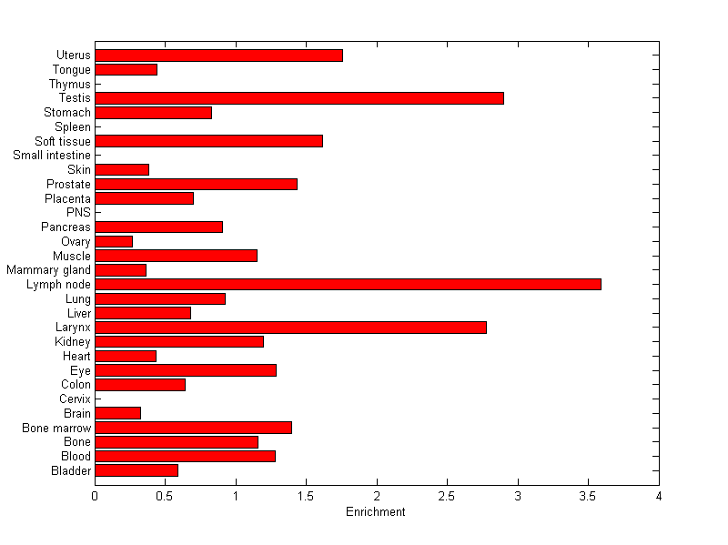 The expression level is normalized with tissue-library size. Each value for a gene in a tissue is a ratio of observed ESTs to the expected one in this tissue. The expected number of ESTs is the product of total ESTs of the gene and the fraction of total ESTs in the tissue among all ESTs in 30 tissues.