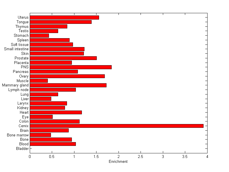 The expression level is normalized with tissue-library size. Each value for a gene in a tissue is a ratio of observed ESTs to the expected one in this tissue. The expected number of ESTs is the product of total ESTs of the gene and the fraction of total ESTs in the tissue among all ESTs in 30 tissues.