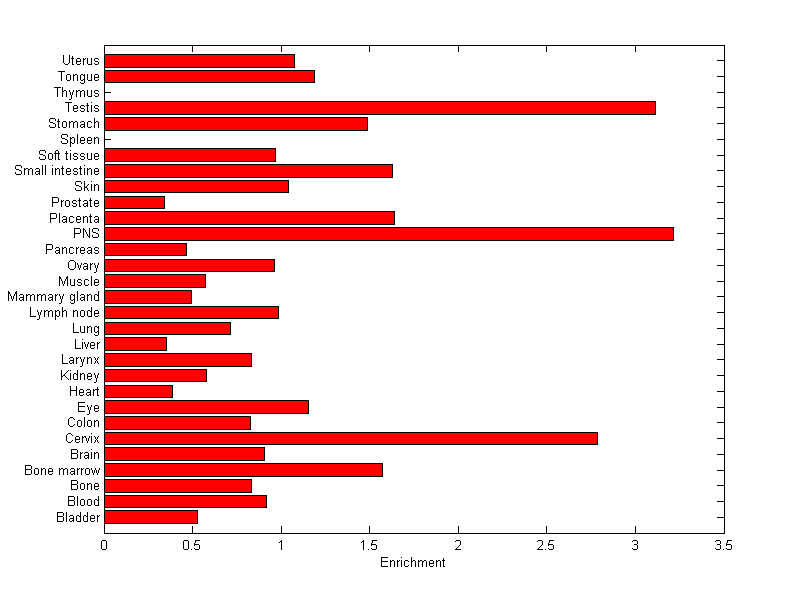 The expression level is normalized with tissue-library size. Each value for a gene in a tissue is a ratio of observed ESTs to the expected one in this tissue. The expected number of ESTs is the product of total ESTs of the gene and the fraction of total ESTs in the tissue among all ESTs in 30 tissues.