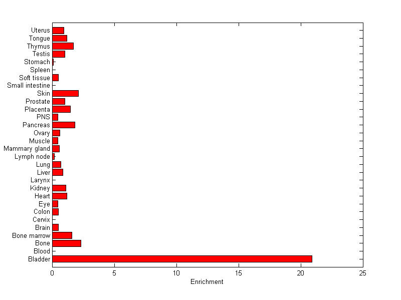 The expression level is normalized with tissue-library size. Each value for a gene in a tissue is a ratio of observed ESTs to the expected one in this tissue. The expected number of ESTs is the product of total ESTs of the gene and the fraction of total ESTs in the tissue among all ESTs in 30 tissues.