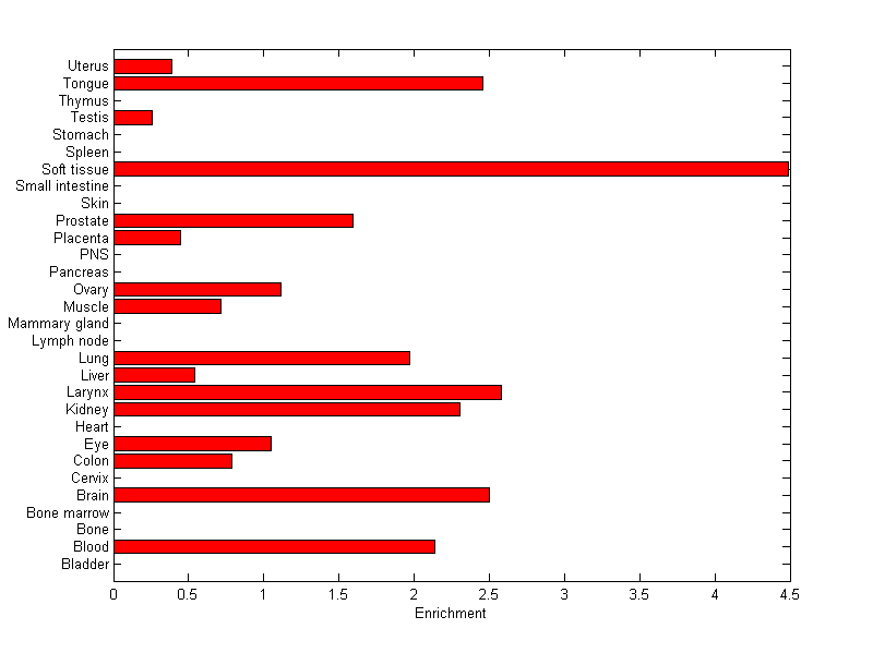 The expression level is normalized with tissue-library size. Each value for a gene in a tissue is a ratio of observed ESTs to the expected one in this tissue. The expected number of ESTs is the product of total ESTs of the gene and the fraction of total ESTs in the tissue among all ESTs in 30 tissues.