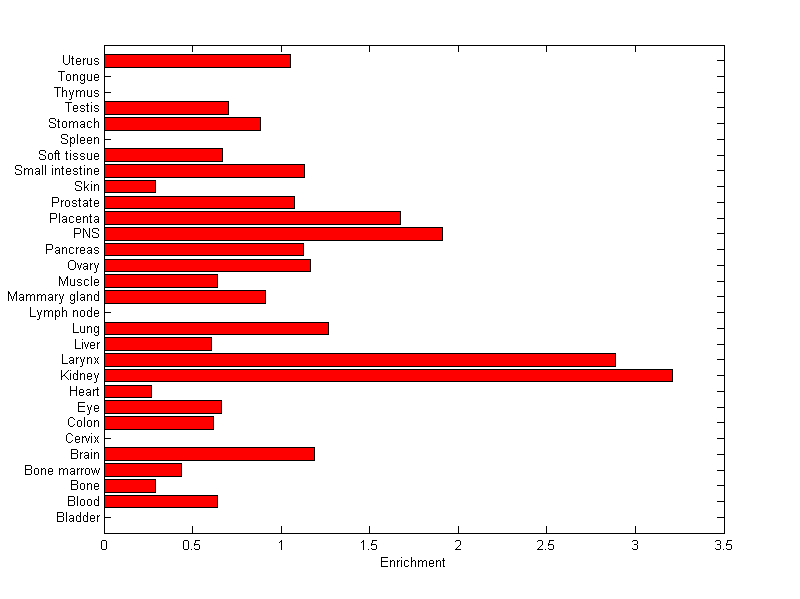 The expression level is normalized with tissue-library size. Each value for a gene in a tissue is a ratio of observed ESTs to the expected one in this tissue. The expected number of ESTs is the product of total ESTs of the gene and the fraction of total ESTs in the tissue among all ESTs in 30 tissues.