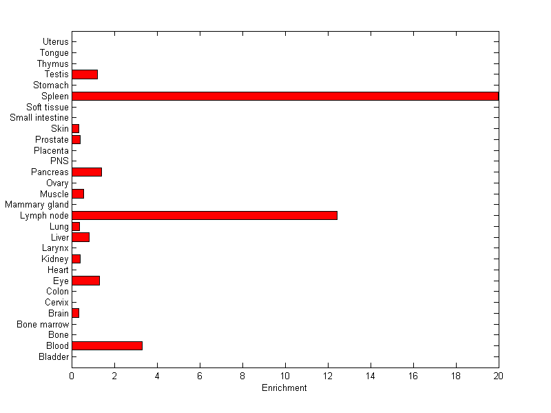 About the profile: The expression level is normalized with tissue-library size. Each value for a gene in a tissue is a ratio of observed ESTs to the expected one in this tissue. The expected number of ESTs is the product of total ESTs of the gene and the fraction of total ESTs in the tissue among all ESTs in 30 tissues. Summary: This gene is preferentially expressed in [lymph_node, spleen] Download: |