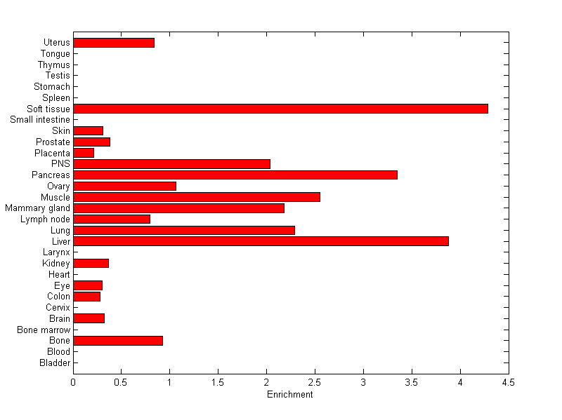The expression level is normalized with tissue-library size. Each value for a gene in a tissue is a ratio of observed ESTs to the expected one in this tissue. The expected number of ESTs is the product of total ESTs of the gene and the fraction of total ESTs in the tissue among all ESTs in 30 tissues.