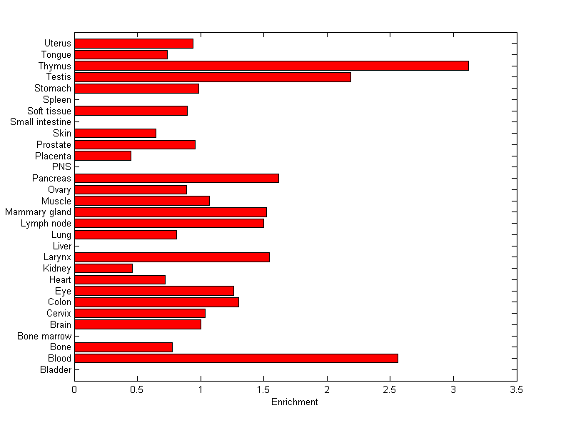 The expression level is normalized with tissue-library size. Each value for a gene in a tissue is a ratio of observed ESTs to the expected one in this tissue. The expected number of ESTs is the product of total ESTs of the gene and the fraction of total ESTs in the tissue among all ESTs in 30 tissues.