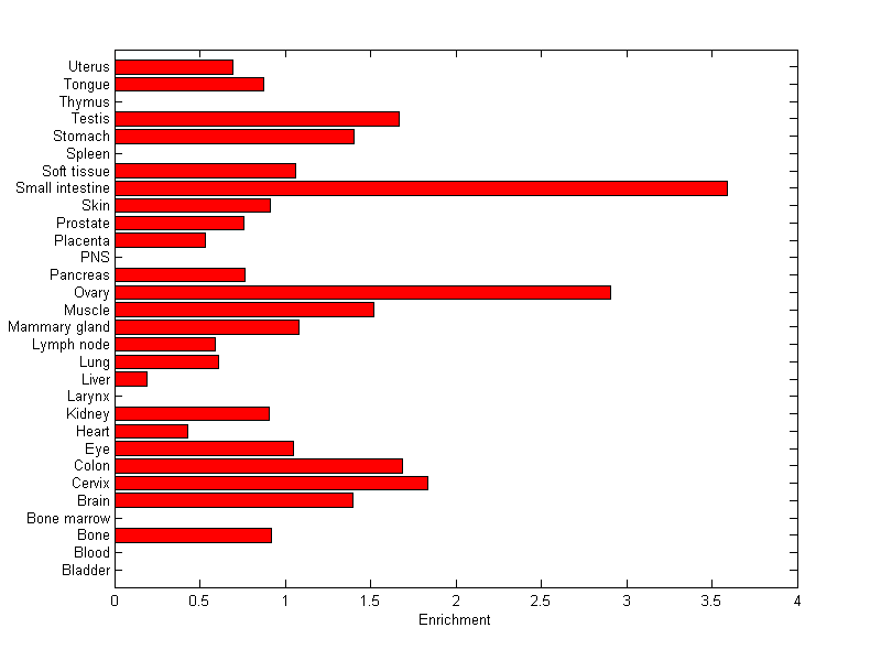 The expression level is normalized with tissue-library size. Each value for a gene in a tissue is a ratio of observed ESTs to the expected one in this tissue. The expected number of ESTs is the product of total ESTs of the gene and the fraction of total ESTs in the tissue among all ESTs in 30 tissues.