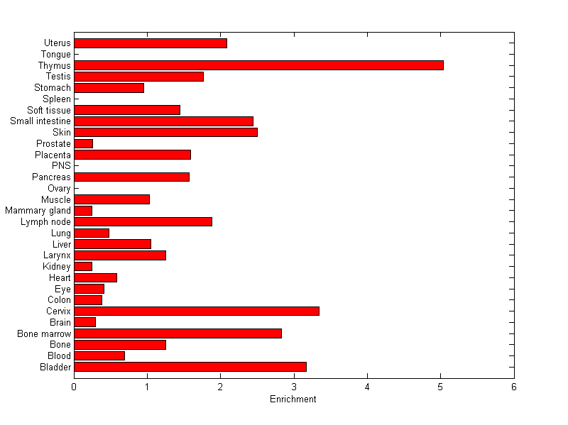 The expression level is normalized with tissue-library size. Each value for a gene in a tissue is a ratio of observed ESTs to the expected one in this tissue. The expected number of ESTs is the product of total ESTs of the gene and the fraction of total ESTs in the tissue among all ESTs in 30 tissues.