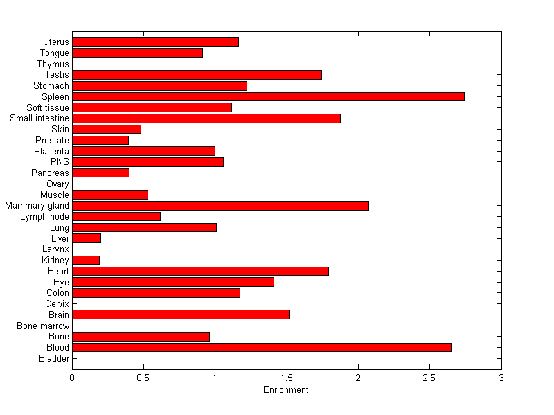 The expression level is normalized with tissue-library size. Each value for a gene in a tissue is a ratio of observed ESTs to the expected one in this tissue. The expected number of ESTs is the product of total ESTs of the gene and the fraction of total ESTs in the tissue among all ESTs in 30 tissues.