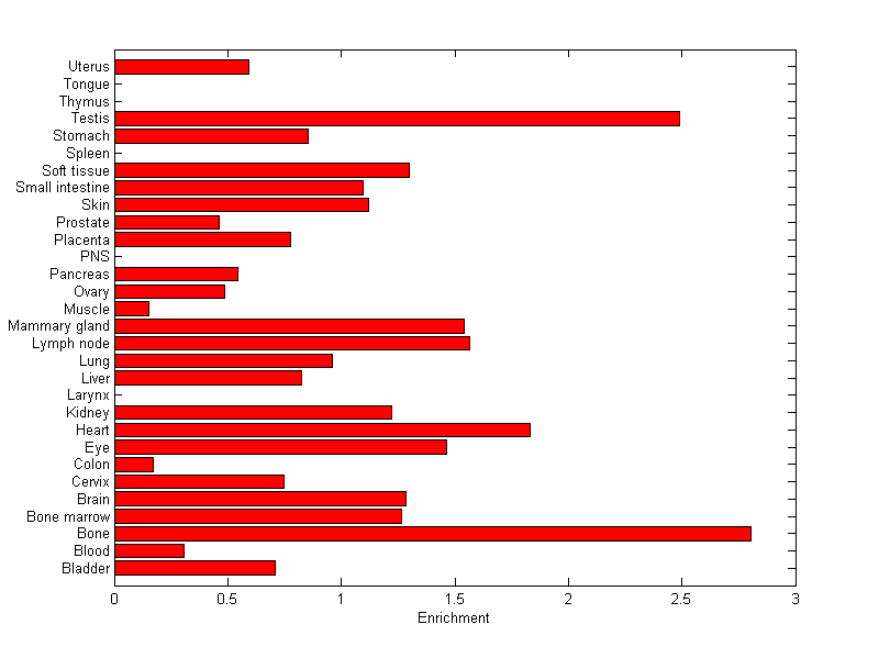 The expression level is normalized with tissue-library size. Each value for a gene in a tissue is a ratio of observed ESTs to the expected one in this tissue. The expected number of ESTs is the product of total ESTs of the gene and the fraction of total ESTs in the tissue among all ESTs in 30 tissues.