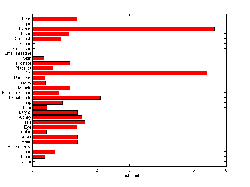 The expression level is normalized with tissue-library size. Each value for a gene in a tissue is a ratio of observed ESTs to the expected one in this tissue. The expected number of ESTs is the product of total ESTs of the gene and the fraction of total ESTs in the tissue among all ESTs in 30 tissues.